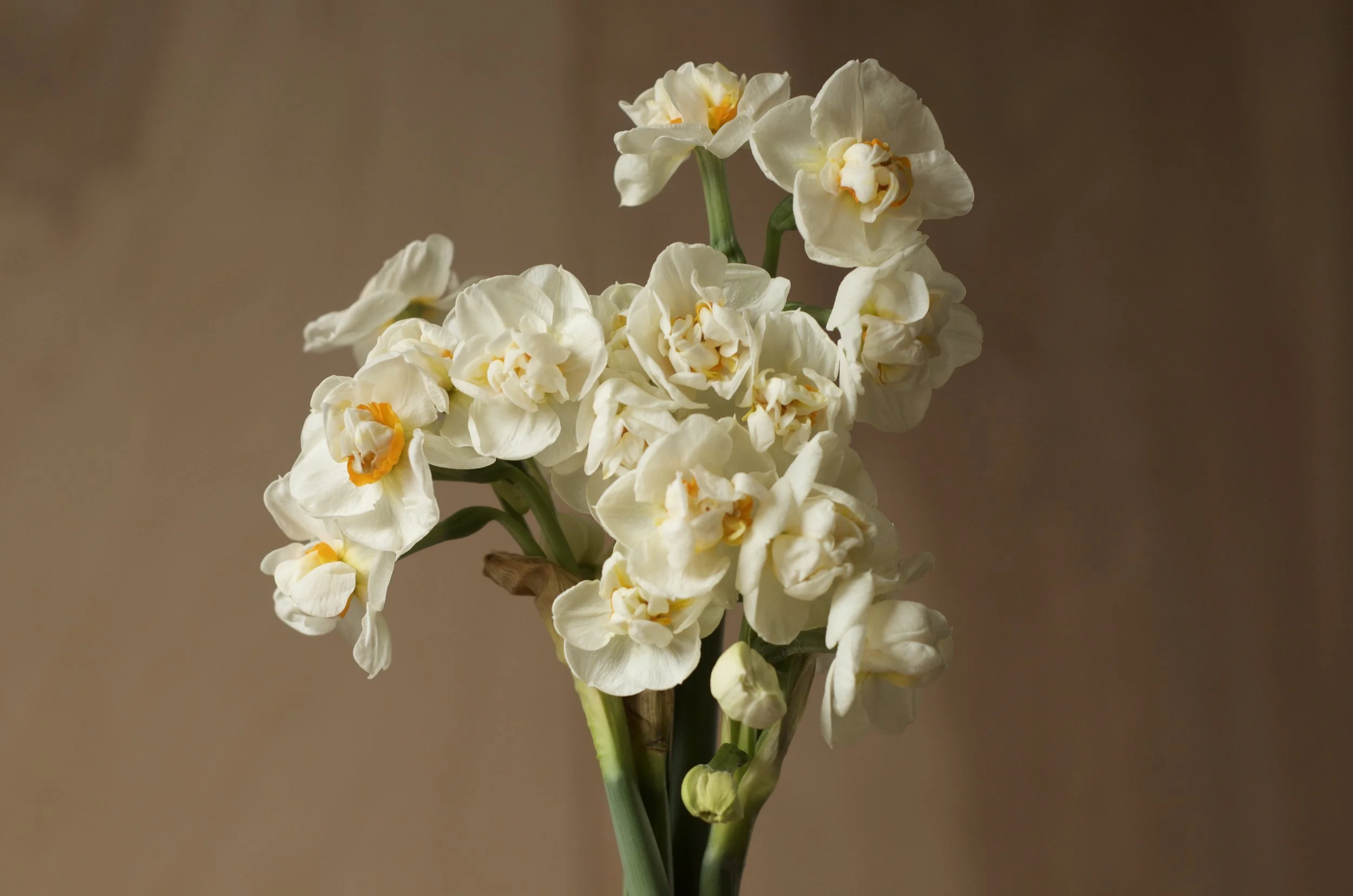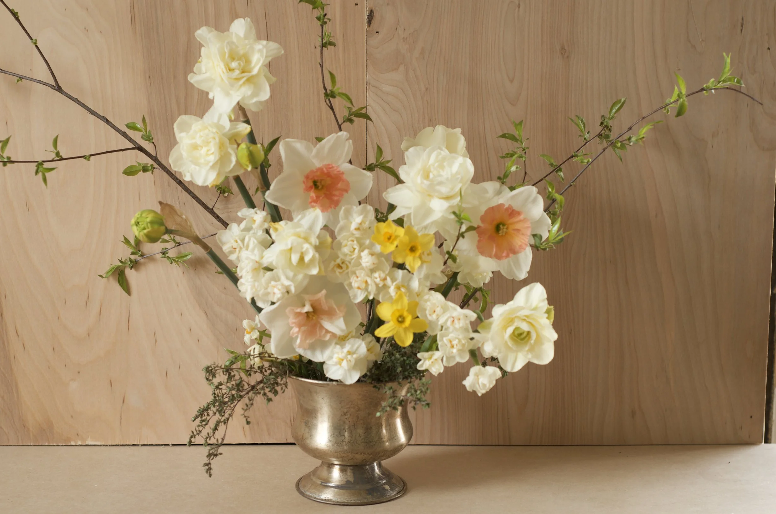 I love displaying a bunch of daffodils together en masse. Daffodil stems contain a sap that is toxic to other flowers, so you often see them grouped together on their own in arrangements and bouquets. Put them all together and wow! An instant spring boost!