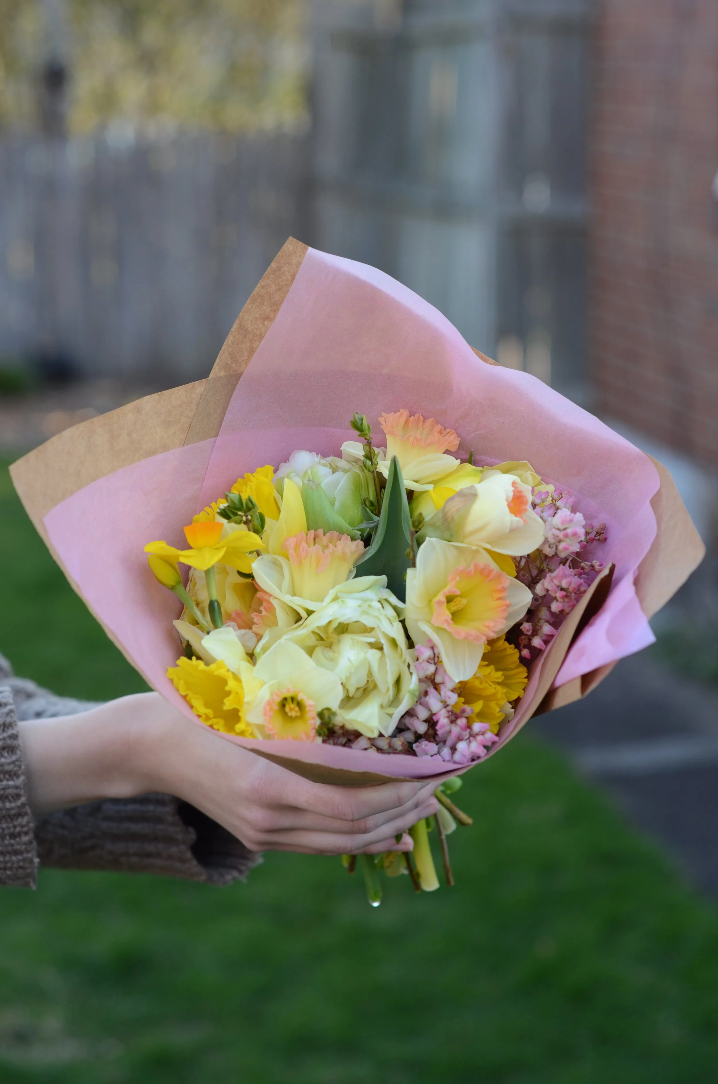 Celebrate the arrival of spring with three weeks of beautiful spring flowers! Our generously sized spring bouquets mainly feature specialty tulips. In the 2026 season we will be adding other special spring flowers, such as fancy narcissus and ranunculus, to complement the tulips.